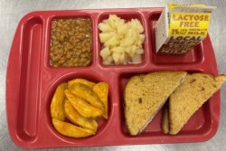 Breakfast: Mini Bagel, Fruit, Milk, Juice Lunch: Toasted Ham & Swiss, French Fries, Green Beans, Pears, Milk