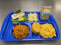 - Breakfast: Muffin, Cottage Cheese, Fruit, Milk, Juice Lunch: Macaroni & Cheese, Garlic Toast, Romaine, Peas & Carrots, Pears, Milk