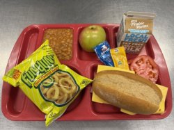 Breakfast: Tortilla Wrapped Omelet, Fruit, Milk, Juice Lunch: Sub Sandwich, Funyuns, Shredded Lettuce, Tomato, Mixed Fruit, Milk