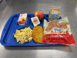 Breakfast: Breakfast Pizza, Fruit, Milk, Juice Lunch: Pancakes, Scrambled Eggs & Ham, Dragon Punch, Hashbrown, Apple, Milk