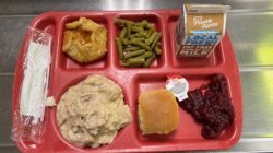 Breakfast: PB & Honey, Fruit, Milk, Juice Lunch: Turkey Gravy, Mashed Potatoes, Dinner Roll, Green Beans, Cranberries, Apple Blossom, Milk