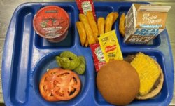 - Breakfast: Blueberry Bagel & Cream Cheese, Fruit, Milk, Juice Lunch: Cheeseburger, French Fries, Tomato Slice, Strawberry Cup, Milk