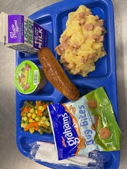 - Breakfast: Breakfast Pizza, Fruit, Milk, Juice Lunch: Scalloped Potatoes and Ham, Garlic Breadstick, Mixed Veggies, Applesauce Cup, Bug Bite, Milk,
