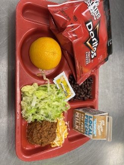 - Breakfast: Breakfast Pizza, Fruit, Milk, Juice Lunch: Walking Taco, Shredded Cheese, Black Beans, Shredded Lettuce, Orange, Milk