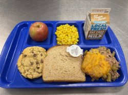 - Breakfast: Breakfast Pizza, Fruit, Milk, Juice Lunch: Tater Tot Casserole, Bread Slice, Corn, Apple, Chocolate Chip Cookie, Milk