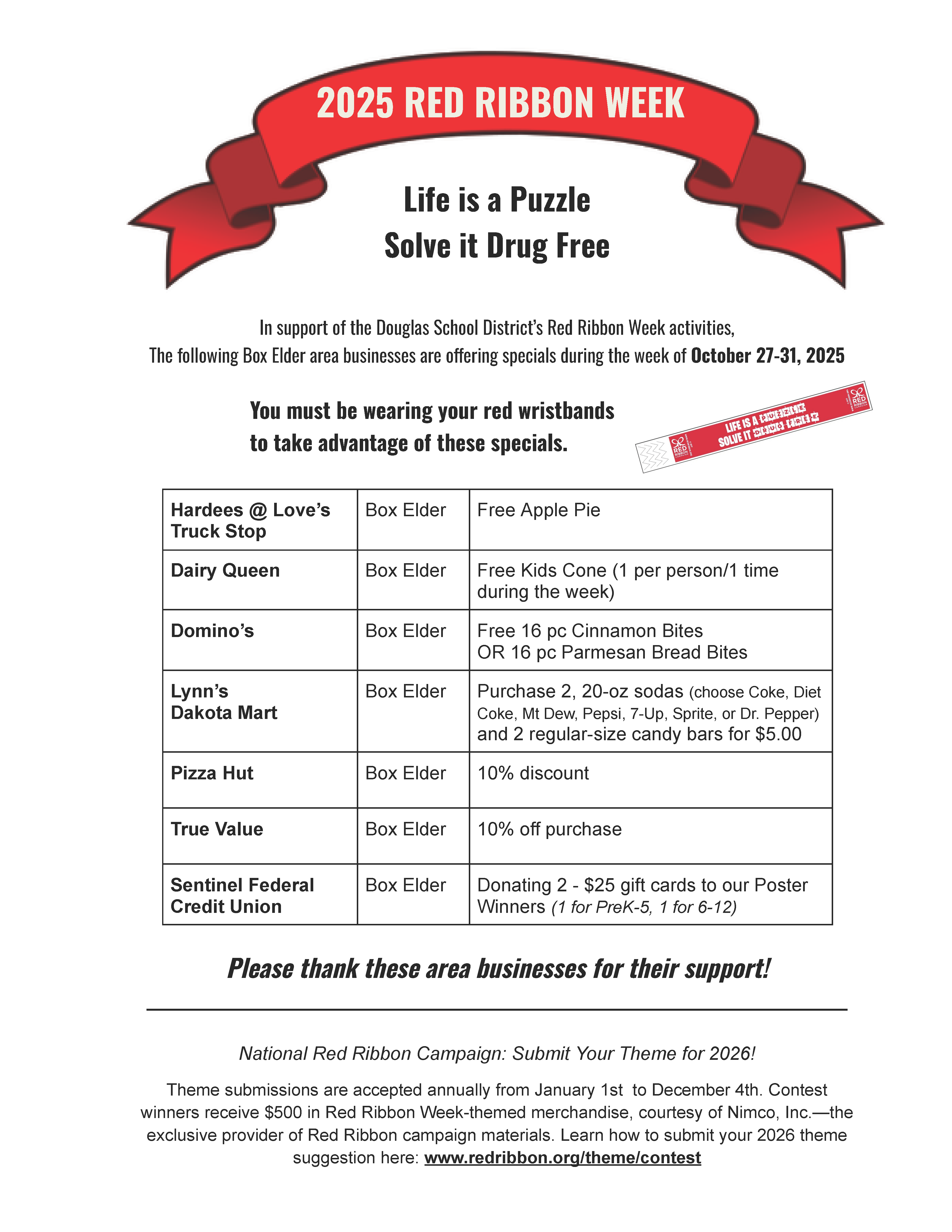 In support of the Douglas School District’s Red Ribbon Week activities, the following Box Elder area businesses are offering specials during the week of October 27-31, 2025.